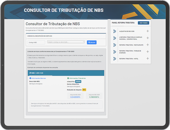 de NBS, você identifica rapidamente código correto, a descrição do serviço e as alíquotas aplicáveis conforme a nova legislação da reforma