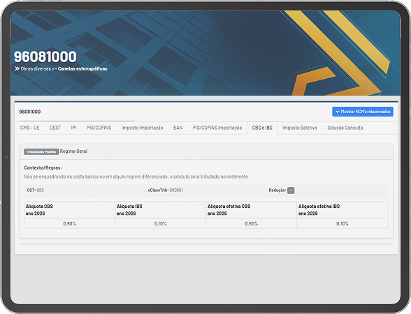nova legislação tributária. Basta digitar o NCM para visualizar os percentuais oficiais de CBS e IBS que valerão a partir de 2026.