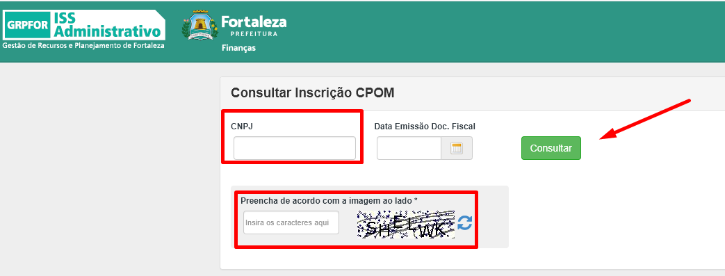 Para consultar, basta informar o número do CNPJ do prestador, e preencher os caracteres de segurança. Ao clicar em “consultar” o sistema vai informar se o prestador possui ou não cadastro no CPOM de Fortaleza.
